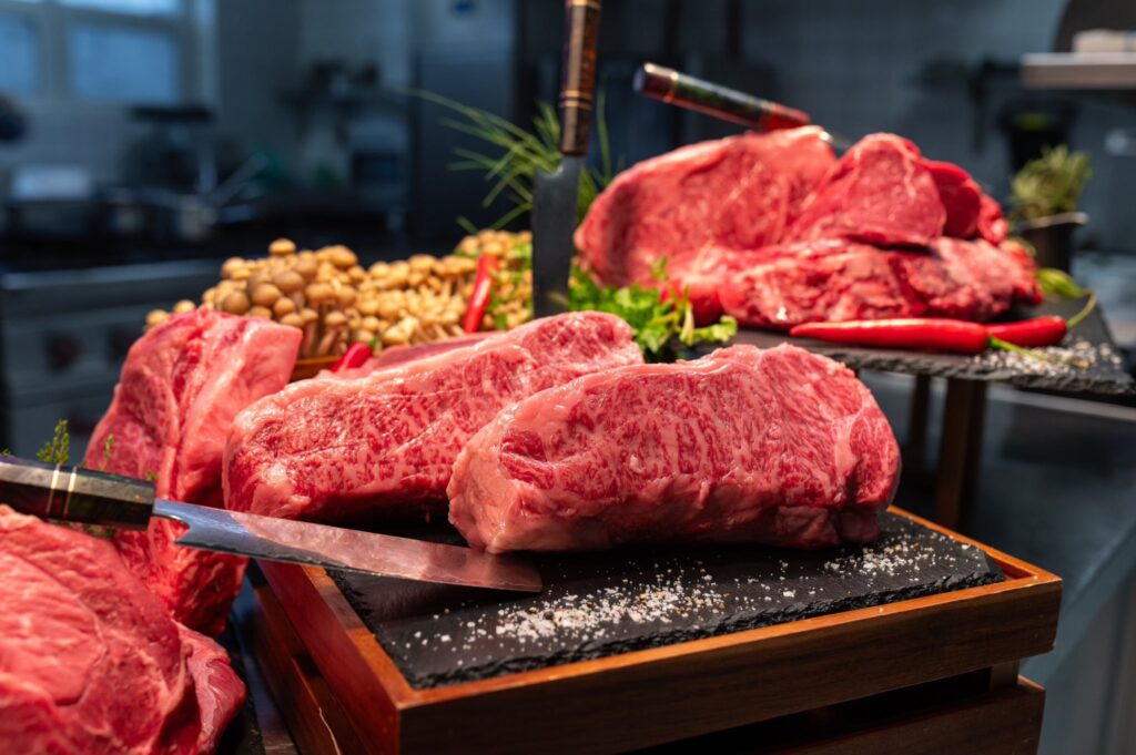 Australský Wagyu mignon s shitake houbami, batatou, křupavými yuca chipsy a chilli chřestem, podávaný s miso demi glace a kafírovou limetou