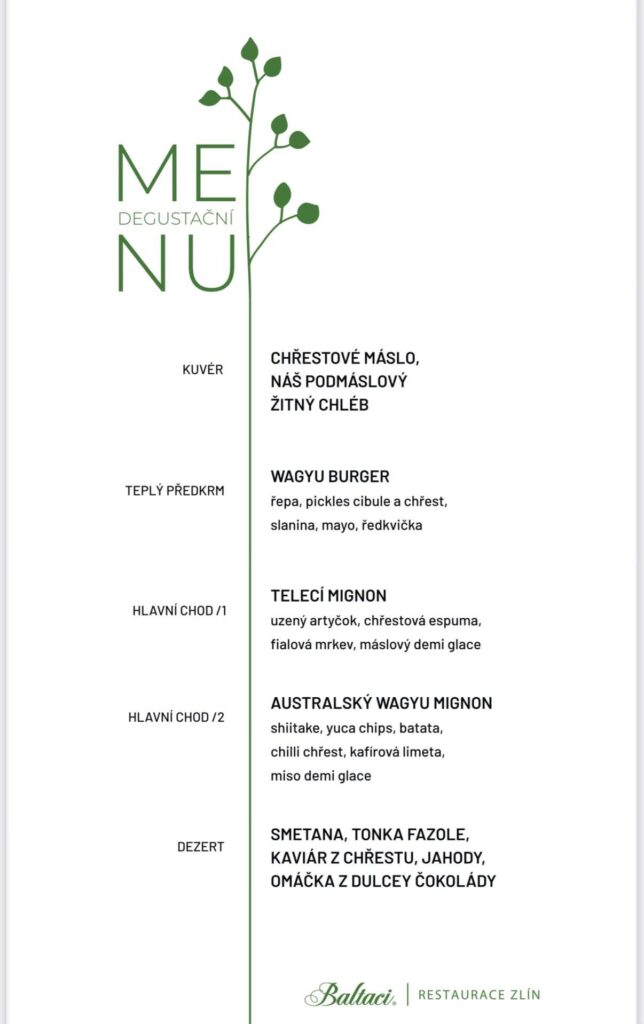 Menu večera je pečlivě sestaveno tak, aby zvýraznilo sezónní ingredience a nabídlo harmonii chutí: